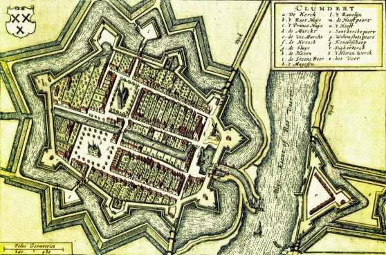 In 1581 werd ‘de Klundert’ op aandringen van Willem van Oranje een vestingstadje, voorzien van drie poorten: naast de haven de Waterpoort, later de Zevenbergsepoort, aan de oostzijde de Landpoort, later de Schanspoort, en aan de westzijde de Hilsepoort. Aan de noordzijde werd in de wal een spuisluis gemaakt: het Verlaat. De aldus ontstane vesting werd vervolgens uitgebreid en versterkt, onder andere met een fortificatie op de zuidelijke oever van de Keene: de schans Bloemendaal oftewel ‘de Suykerberg’.